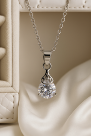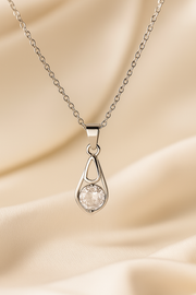 An elegant teardrop silhouette cradles a luminous crystal, finished in sleek silver with waterproof and tarnish-free technology for enduring shine.