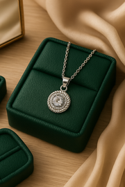 A round pendant with a radiant twist-border design, centered with a sparkling crystal for waterproof, anti-tarnish, everyday elegance.