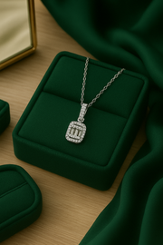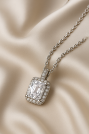 An emerald-cut pendant framed by a radiant halo, symbolizing strength, grace, and timeless elegance. Finished in waterproof, anti-tarnish silver.