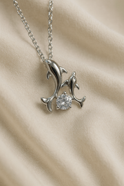 Twin dolphins dance around a brilliant crystal, symbolizing love, joy, and lasting connection. Finished in waterproof, anti-tarnish silver.