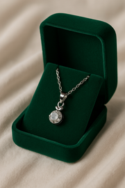A bezel-set solitaire pendant glowing with timeless elegance — waterproof, anti-tarnish, and perfect for everyday radiance.