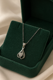 A dazzling teardrop pendant embracing a radiant crystal, crafted in waterproof, anti-tarnish silver to shine with every glance.